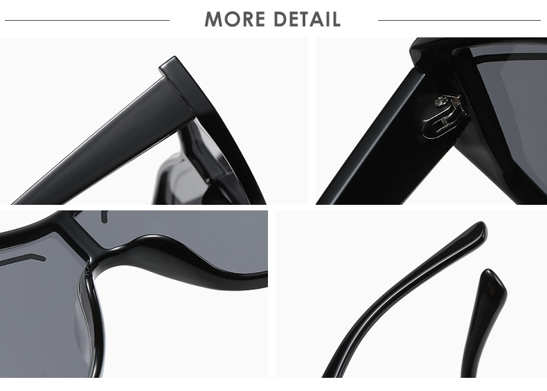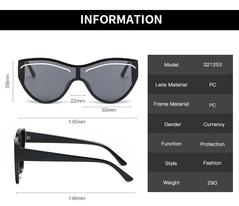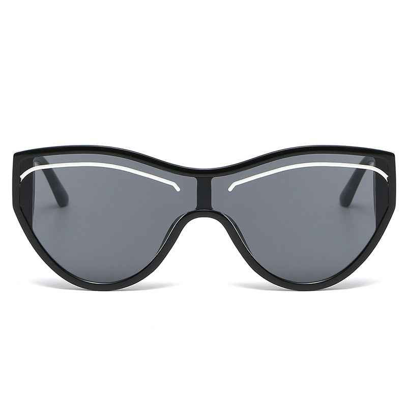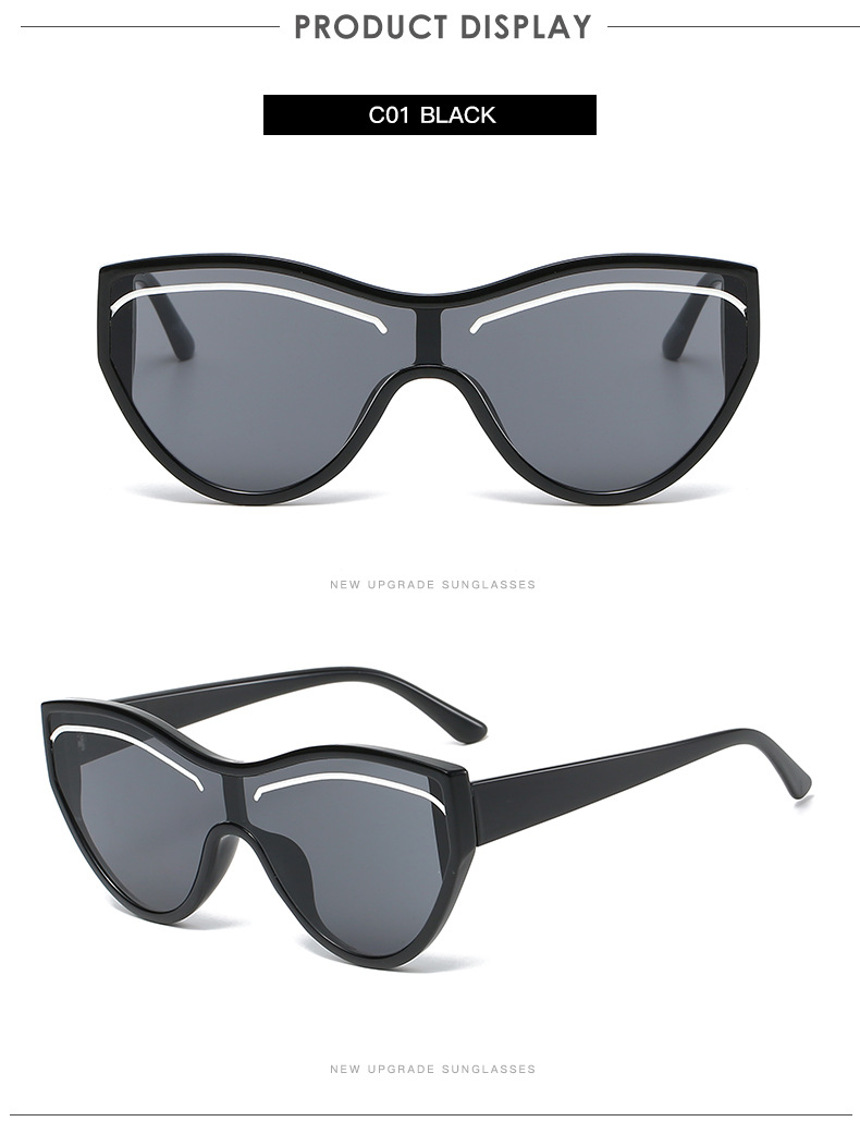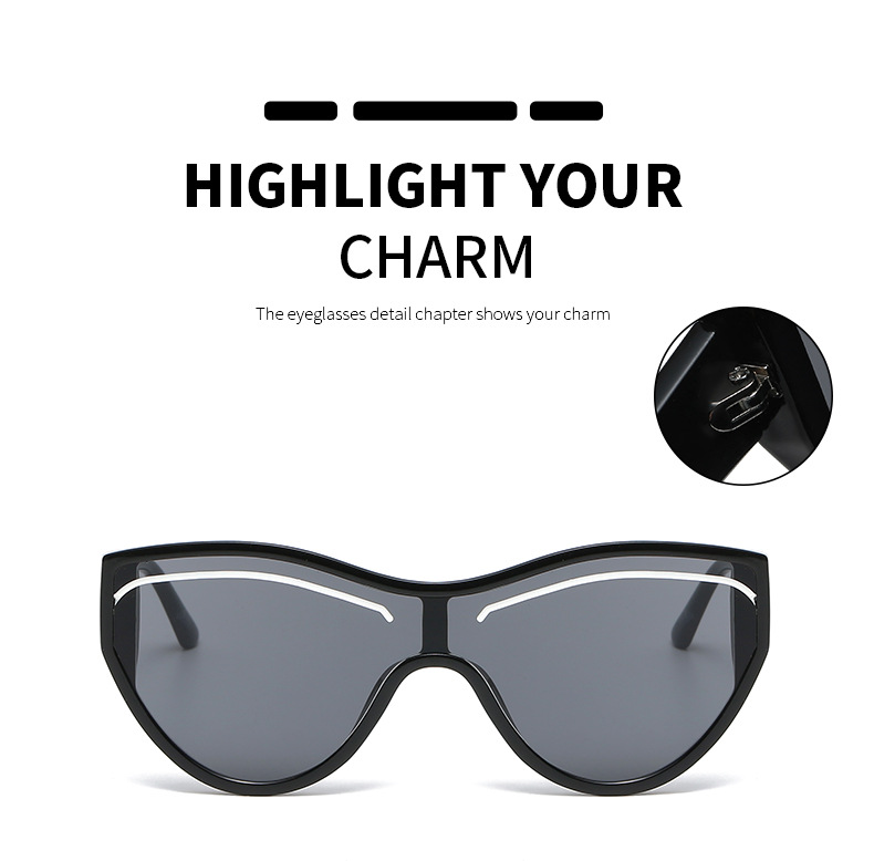 Answer 1: These sunglasses feature a bold cat-eye silhouette with a seamless one-piece lens and distinctive eyebrow-line detailing, ideal for creating a trendy, street-style look.