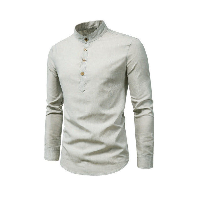 Men's Fashion Slim Solid Color Long Sleeve Business Stand Collar Cotton Linen Half Open Men's Shirt