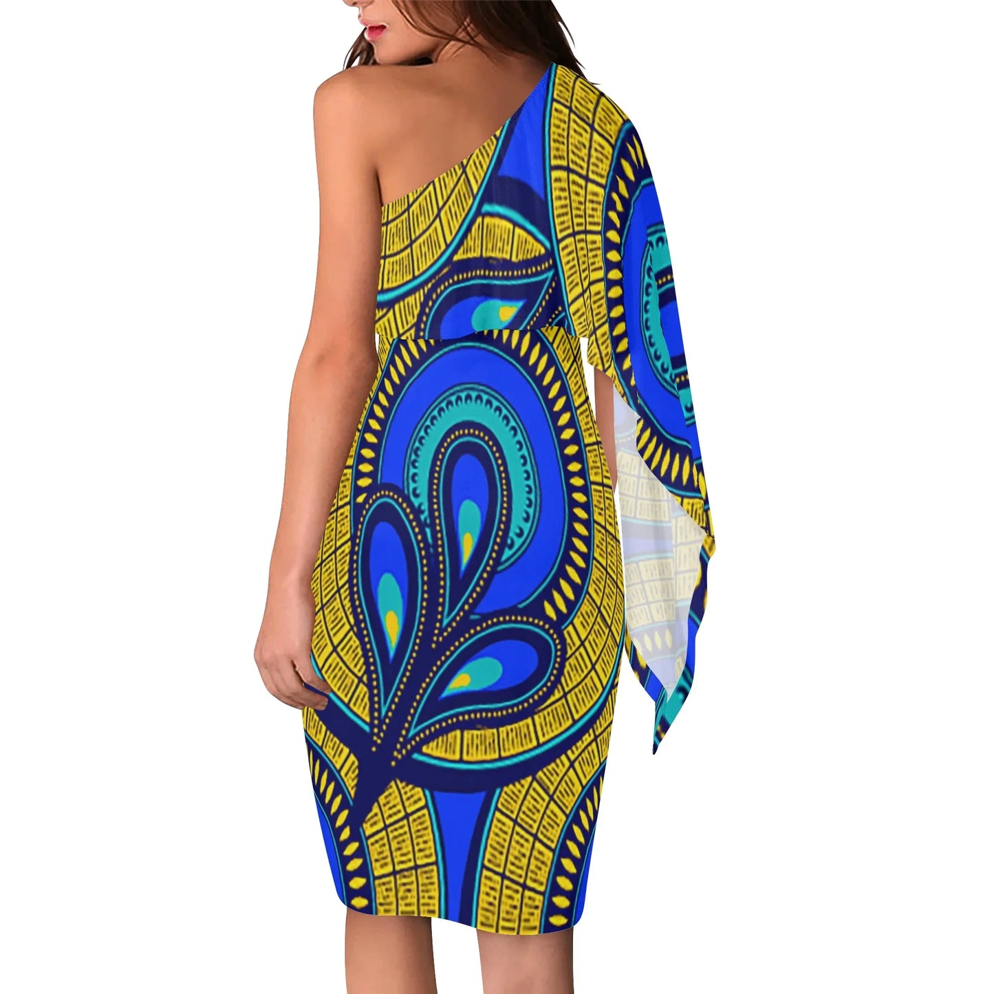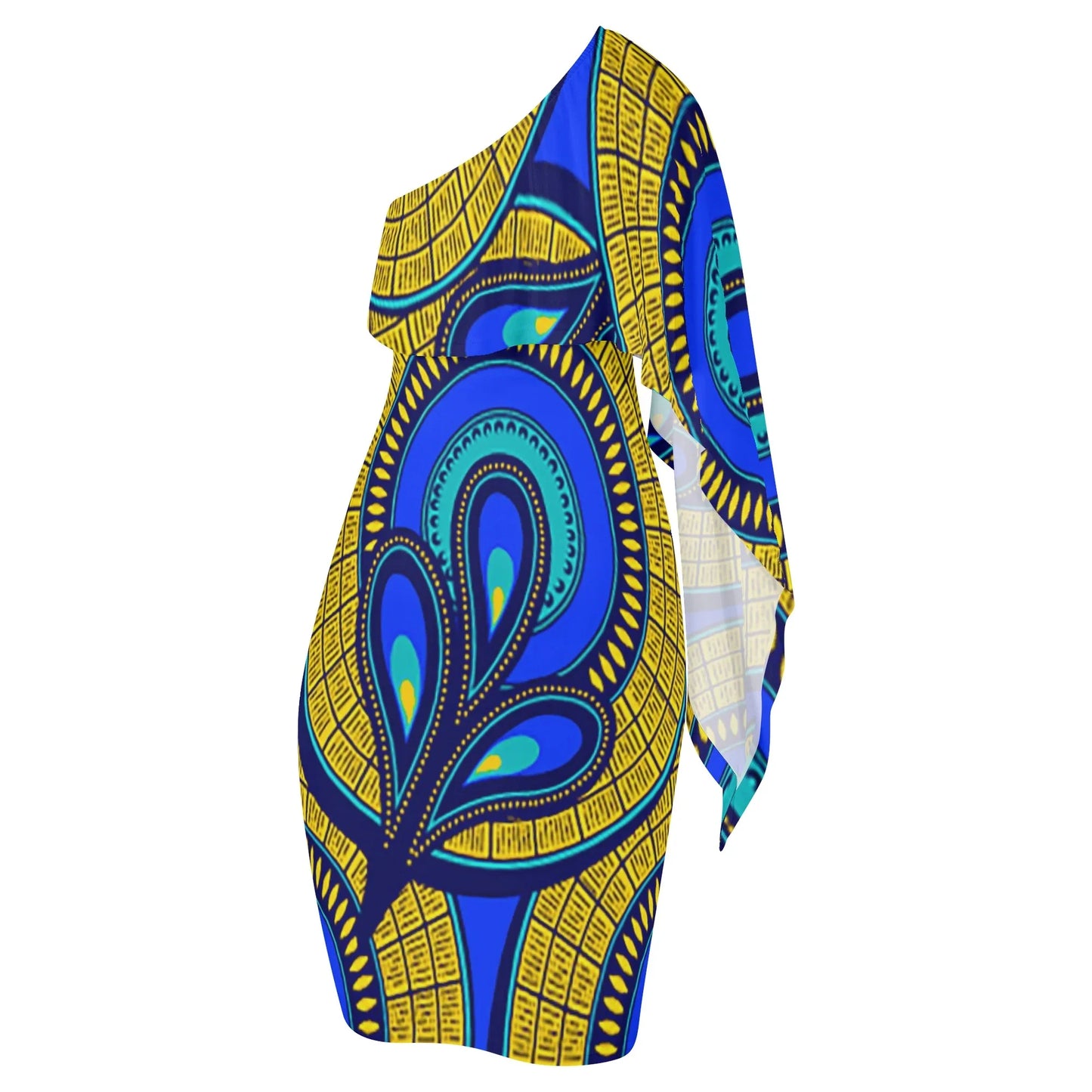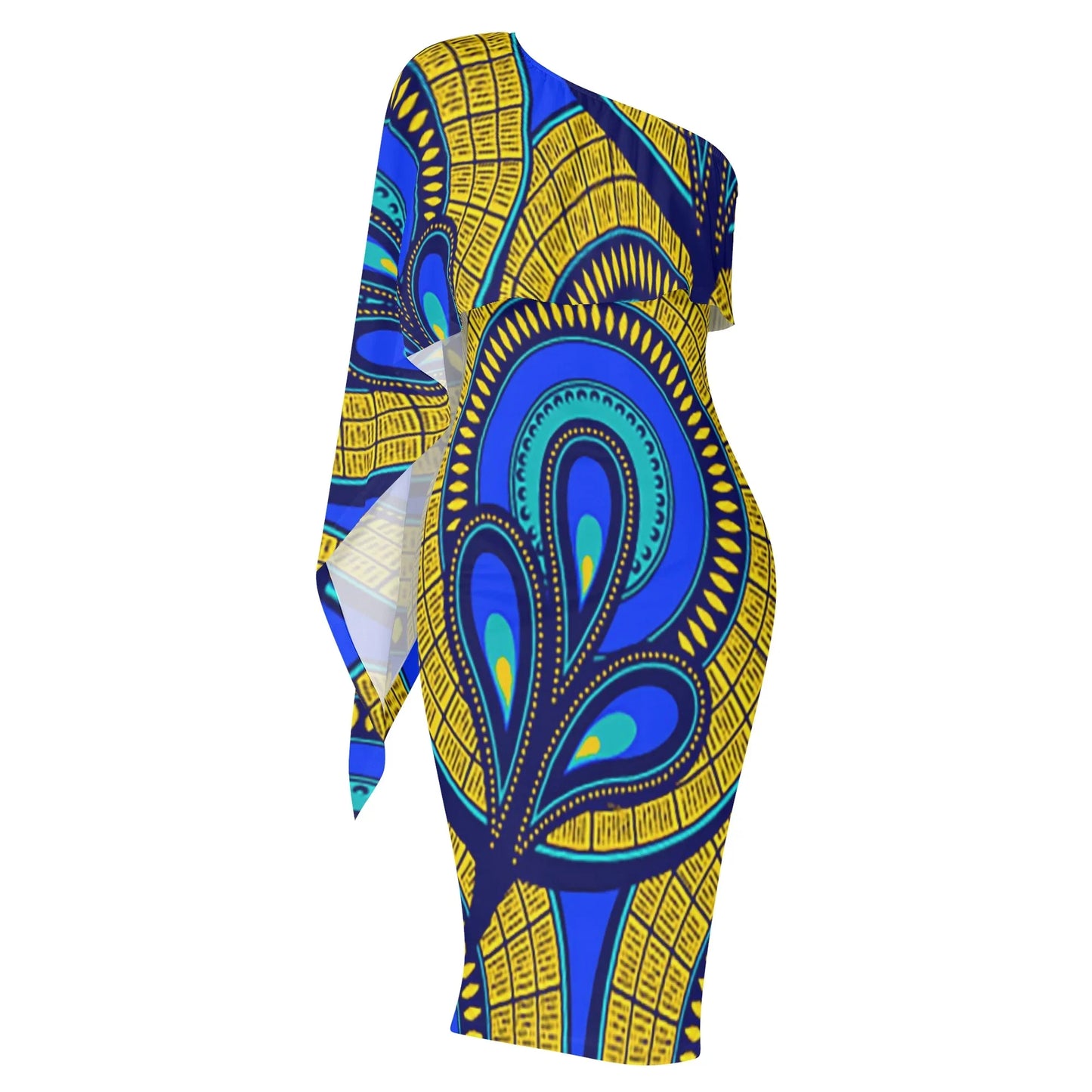 Vivid Azura Blue Spiral - Ethnic-Inspired Pattern Womens One Shoulder Sleeve Evening Formal Dress